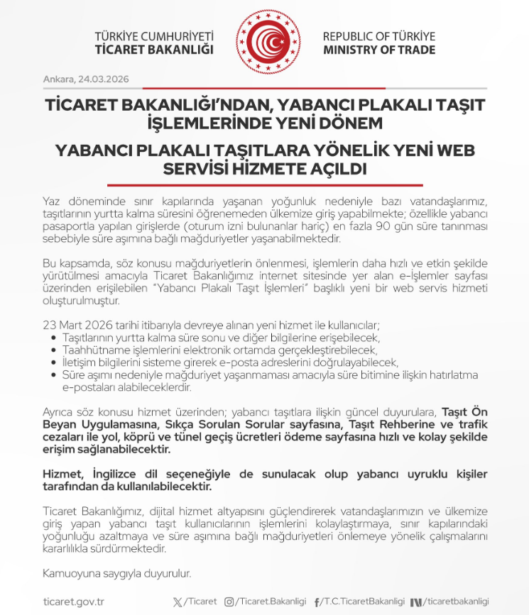 Ticaret Bakanlığı tarafından devreye alınan “Yabancı Plakalı Taşıt İşlemleri Hizmeti” hakkında aşağıdaki bağlantıdan bilgi edinilmesi mümkündür.